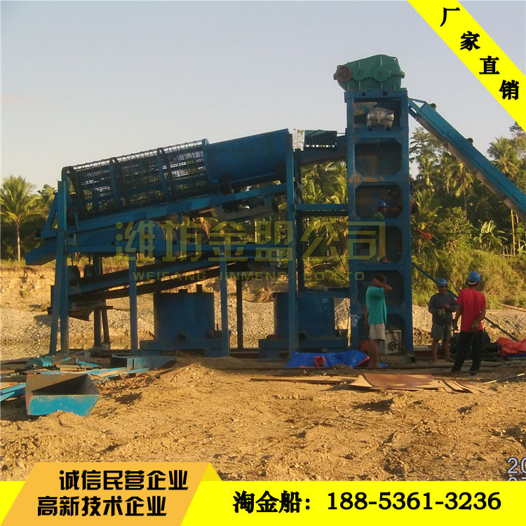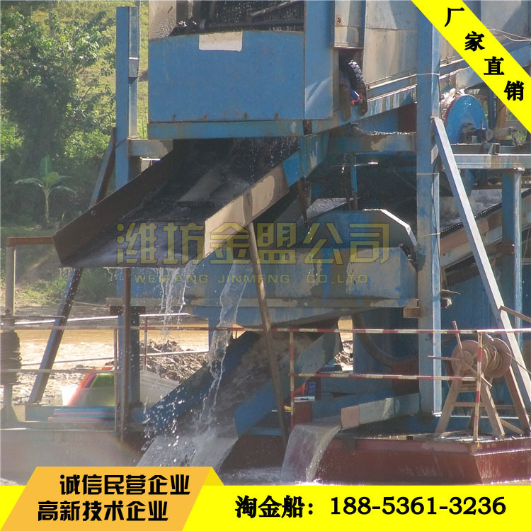 淘金船、淘金設(shè)備選礦經(jīng)滾筒篩篩分后,5mm~15m的礦物料進(jìn)入大顆粒金選礦槽內(nèi)選礦,調(diào)整好溜槽的角度、水流速,用進(jìn)口三菱金氈回收大顆粒金。