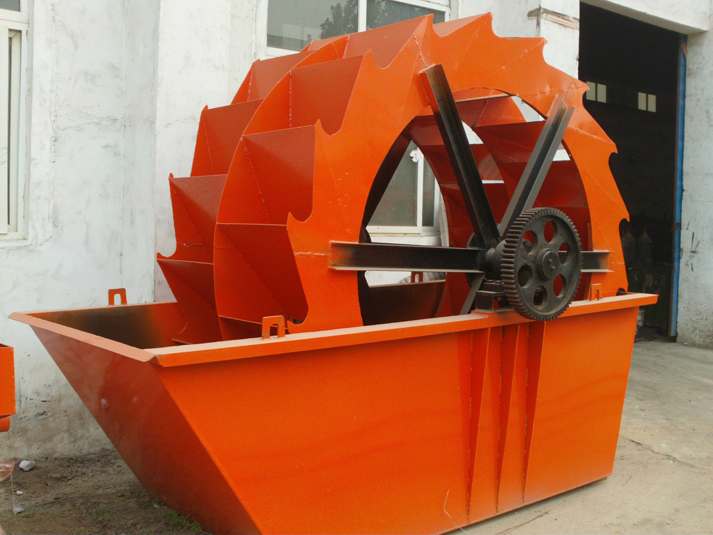 輪斗洗砂機(jī)工作時(shí),電機(jī)通過(guò)三角帶、減速機(jī)、齒輪減速后帶動(dòng)葉輪緩慢轉(zhuǎn)動(dòng),砂石由給料槽進(jìn)入洗槽中,在葉輪的帶動(dòng)下翻滾,并互相研磨,除去覆蓋砂石表面的雜質(zhì),同時(shí)破壞包覆砂粒的水汽層,以利于脫水;同時(shí)加水,形成強(qiáng)大水流,及時(shí)將雜質(zhì)及比重小的異物帶走,并從溢出口洗槽排出,完成清洗作用。干凈的砂石由葉片帶走,砂石從旋轉(zhuǎn)的葉輪倒入出料槽,完成砂石的清洗作用。