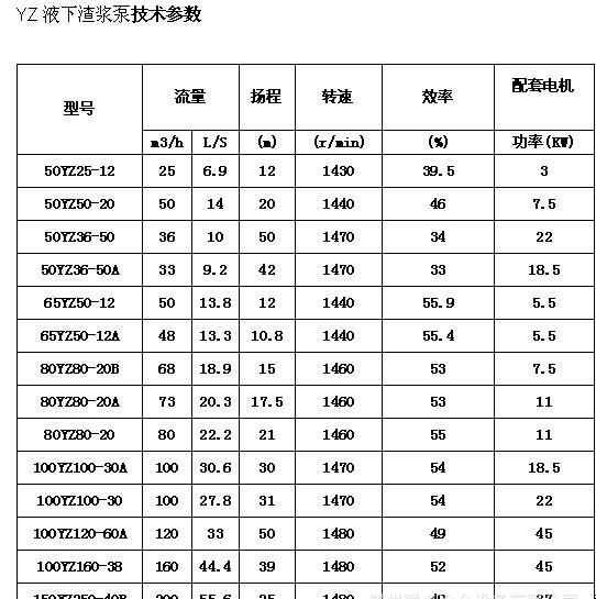 高效節(jié)能YZ型液下渣漿泵性能參數(shù):