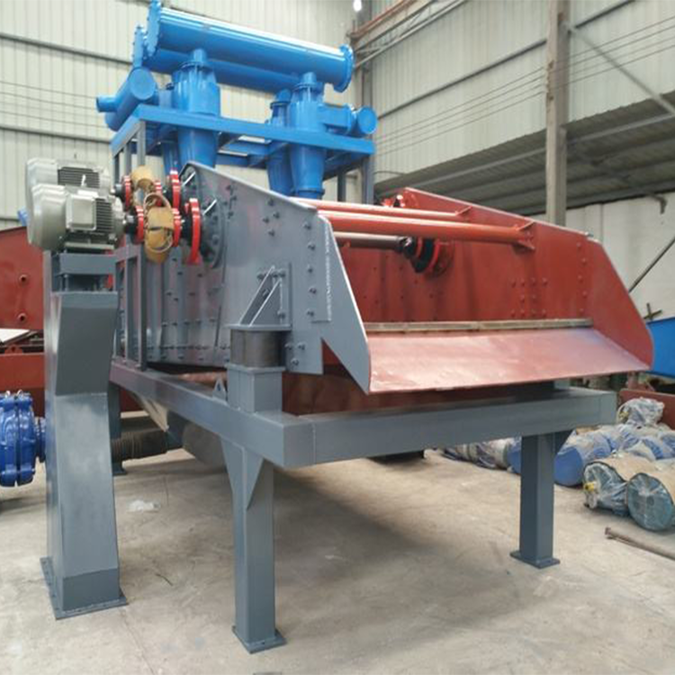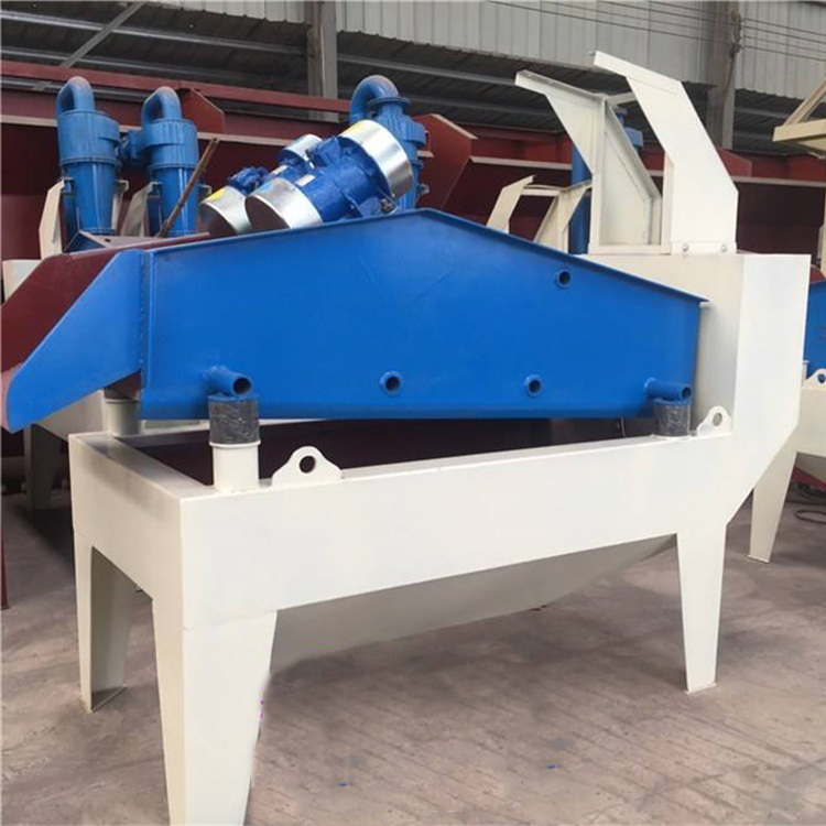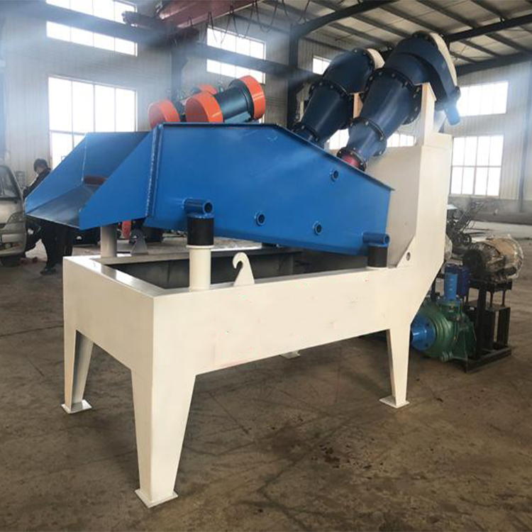 本裝置之由洗料槽、砂漿泵、電機(jī)、旋流器、直線振動(dòng)篩、回料箱等組成。工作時(shí)砂漿泵、水泥混合物輸送至旋流器,通過旋流器離心分級(jí),濃縮的細(xì)砂經(jīng)出料箱供給振動(dòng)篩,經(jīng)直線振動(dòng)篩脫水,細(xì)砂由篩前輸出。少量細(xì)砂由回料箱返回洗料槽。洗料槽液面過高時(shí)經(jīng)溢流管排出。振動(dòng)篩輸出細(xì)砂含水量(25%)調(diào)解細(xì)度模數(shù)可通過改變泵的轉(zhuǎn)速,改變砂漿濃度,調(diào)節(jié)水量,更換出砂嘴來實(shí)現(xiàn),從而完成清洗脫水和分級(jí)三種功能。