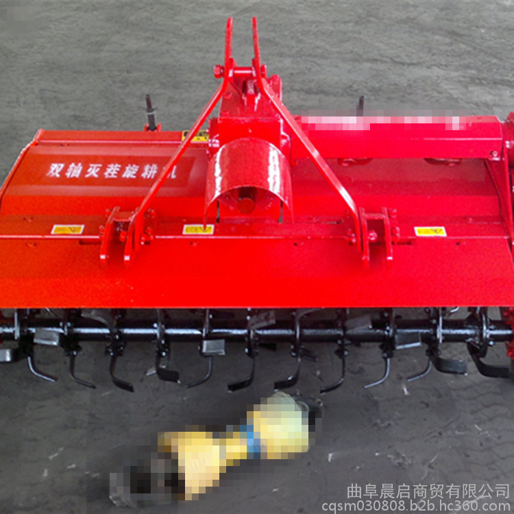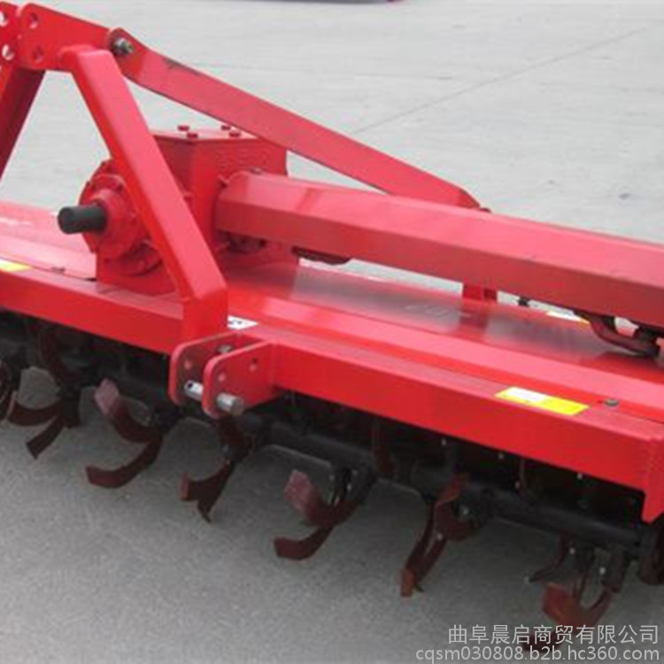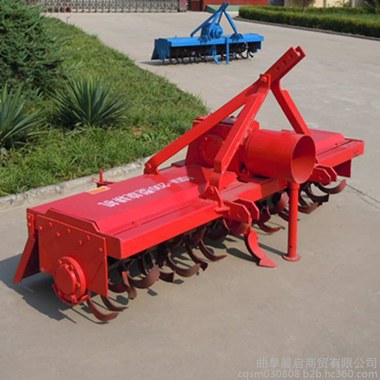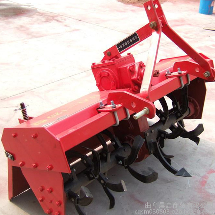 該旋耕機(jī)采用三點(diǎn)懸掛式、萬向節(jié)傳動(dòng),以旋轉(zhuǎn)刀齒為工作部件的驅(qū)動(dòng)型土壤耕作機(jī)械,又稱旋轉(zhuǎn)耕耘機(jī),有較強(qiáng)的碎土能力,一次作業(yè)即能使土壤細(xì)碎,土肥摻和均勻,地面平整,達(dá)到旱地播種或水田栽插的要求,有利于爭取農(nóng)時(shí),提高工效,并能充分利用拖拉機(jī)的功率。工作部件包括旋耕刀輥和按多頭螺線均勻配置的若干把切土刀片,刀輥的旋轉(zhuǎn)方向通常與拖拉機(jī)輪子轉(zhuǎn)動(dòng)的方向一致。切土刀片由前向后切削土層,并將土塊向后上方拋到罩殼和拖板上,使之進(jìn)一步破碎。