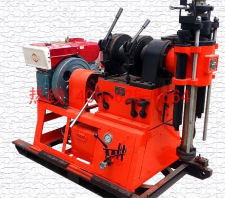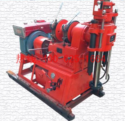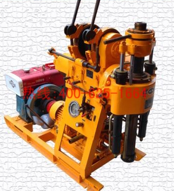 XY-1A-1鉆機簡介XY-1A-4型鉆機是在XY-1A型鉆機的基礎上根據(jù)客戶要求,增加泥漿泵改制而成的,是一種油壓給進的高速帶水泵輕便鉆機。1.1.鉆機用途及適用范圍1.1.1.主要用于固體礦床的普查勘探及工程地質勘察等鉆孔,各種混凝土結構的檢查孔。1.1.2. 可根據(jù)地層的不同選用金剛石、合金及鋼粒等鉆頭進行鉆進。1.1.3.當終孔直徑分別為75mm和46mm時,額定鉆孔深度分別為100m和180m**不得超過各鉆進深度的110%,額定開孔直徑為110mm,_開孔直徑允許為150mm。1.2.鉆機特點1.2.1.具有油壓給進機構,提高鉆進效率,減輕工人勞動強度。1.2.2.鉆機配有上球卡式夾持機構并帶有六方主動鉆桿,可實行不停機倒桿,工作效率高,操作方便,安全可靠。1.2.3.配有孔底壓力計指示壓力便于掌握孔內情況。1.2.4.手柄集中操作方便。1.2.5.鉆機結構緊湊,體積小,重量輕,分解性強,便于搬遷,適合于平原或山區(qū)工作。2.技術規(guī)格2.1.基本參數(shù)項 目 ………………………… 單位 ……………………………………數(shù)值鉆進深度………………………… m ……………………………………100、180鉆桿直徑………………………… mm ……………………………………42、43終孔直徑………………………… mm ……………………………………75、46_開孔直徑…………………… mm ………………………………………150鉆孔傾角……………………………(°)……………………………90°~75°鉆機外形尺寸(L×B×H)………… mm ………………………1700×780×1274鉆機重量(動力機除外)………… Kg ………………………………………4902.2.回轉器項目………………………………… 單位…………………………………數(shù)值立軸轉速(五檔)…………………… r/min ……1010、790、470、295、140立軸行程 ……………………………… mm ……………………………… 450立軸空載向上_移動速度 ………… m/min ……………………………… 3立軸空載向下_移動速度 ………… m/min ……………………………… 4立軸_給進力 ……………………… KN …………………………………15立軸_起重力 ……………………… KN …………………………………25立軸_輸出轉矩 …………………… KN?m …………………………… 0.52.3.卷揚機項目………………………………… 單位 ……………………………… 數(shù)值_提長能力(單繩)……………… KN ………………………………… 11卷筒轉速 …………………………r/min ……………………………121、76、36、卷筒圓線速度(二層)………… m/s …………………………1.05、0.66、0.31卷筒直徑 ………………………… mm ……………………………………… 140鋼絲繩直徑 ……………………… mm ……………………………………… 9.3鋼絲繩容重 ……………………… m ………………………………………… 35抱閘直徑 ………………………… mm ……………………………………… 252閘帶寬度 ………………………… mm ……………………………………… 502.4水泵項目……………………………… 單位………………………………… 數(shù)值類型 …………………………………………………………… 臥式單缸雙作用_排量 …………………………… L/min …………………………… 95(77)_許用壓力 …………………………Mpa …………………………………1.2工作壓力 ………………………………Mpa …………………………………0.7沖程次數(shù) ………………………………次/min …………………………120(96)缸套直徑 ………………………………mm ………………………………… 80活塞行程 ………………………………mm ………………………………… 1002.5.油泵項目…………………………………單位………………………………數(shù)值類型 ……………………………………………………………………… 齒輪泵型號 ……………………………………………………………… YBC—12/80額定壓力 …………………………… Mpa …………………………………8流量 ………………………………… ml/r ………………………………… 8額定轉速 …………………………… r/min ……………………………… 15002.6.動力機項目………………………………單位………………………………數(shù)值柴油機型號 ……………………………………………………………… S1100A2(常柴)功率………………………………… KW… …………………………… 10.3額定轉速 …………………………… r/min ……………………………… 2200電動機型號 …………………………………………………………………Y160M-4額定功率 …………………………… KW ………………………………… 11額定轉速 …………………………… r/min ……………………………… 1460