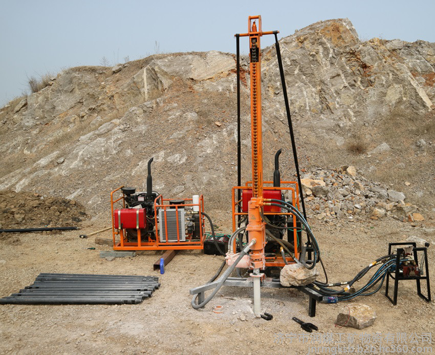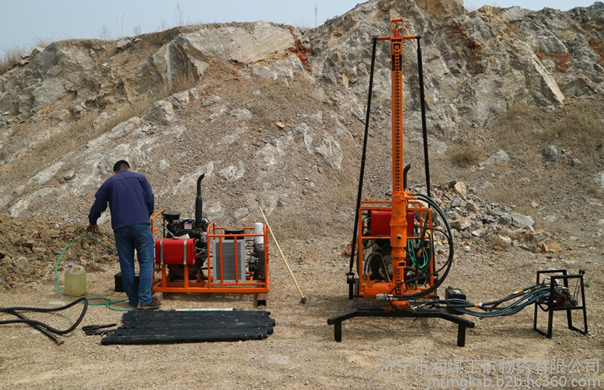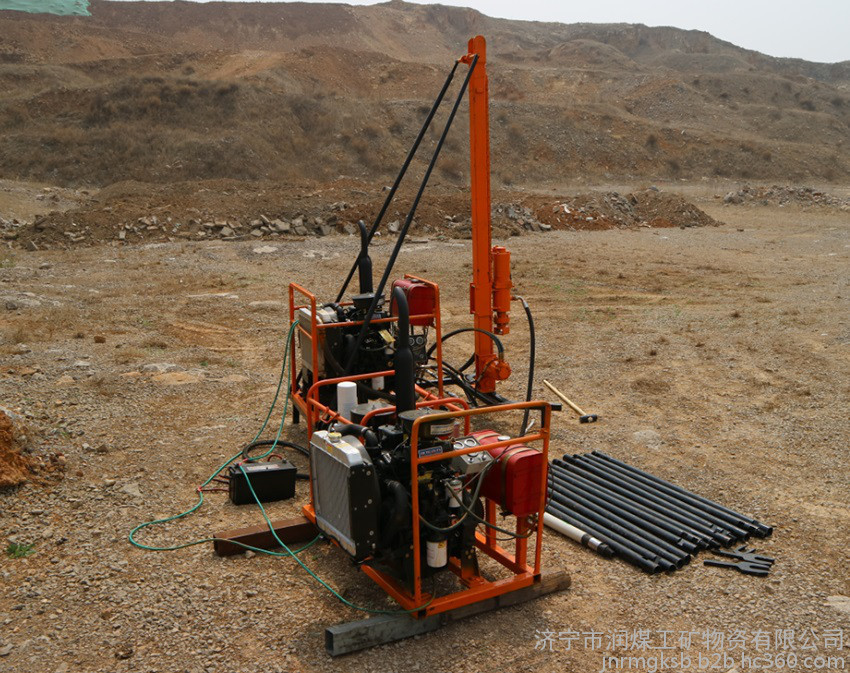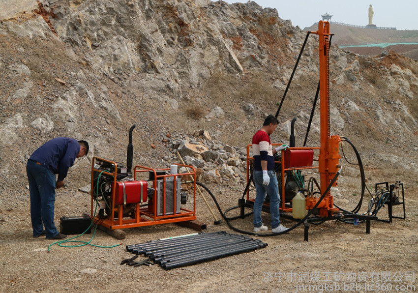 40型人抬鉆機主要適用于山地、黃土塬、丘陵、戈壁、農(nóng)田等復(fù)雜地表的勘探鉆井。鉆機采用全液壓驅(qū)動,山地地區(qū)主要采用空氣鉆井和空氣震擊鉆井。在其它地區(qū),更換鉆具可實現(xiàn)螺旋鉆井,增加泥漿泵可實現(xiàn)泥漿鉆井。