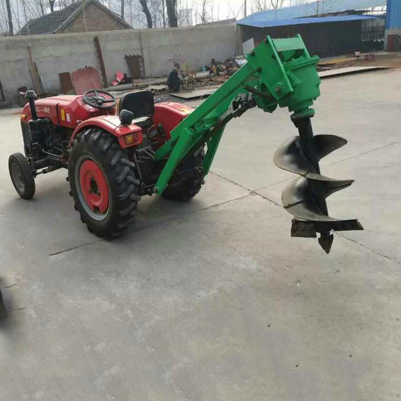 挖坑機(jī)由傳動(dòng)軸、減速器、鉆頭、拉桿和機(jī)架等組成。通過(guò)液壓懸掛裝置掛在拖拉機(jī)后面,由拖拉機(jī)動(dòng)力輸出軸經(jīng)傳動(dòng)系統(tǒng)驅(qū)動(dòng)鉆頭進(jìn)行挖坑作業(yè),鉆頭一般采用雙螺旋型,有的挖坑機(jī)裝有兩個(gè)或兩個(gè)以上的鉆頭,稱多鉆頭挖坑機(jī),能充分利用拖拉機(jī)功率和提高生產(chǎn)率。為使鉆頭在工作時(shí)不因遇到石塊、樹根等障礙物超負(fù)荷時(shí)受損,在傳動(dòng)軸上裝有牙嵌式離合器,在超負(fù)荷狀態(tài)下,離合器自動(dòng)打滑,從而切斷動(dòng)力的傳遞。