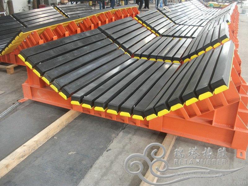緩沖床主要用于替代傳統(tǒng)落料區(qū)緩沖托輥,緩沖床由緩沖條組成,而緩沖條主要應(yīng)用優(yōu)良的高彈性特種橡膠層充分有效吸收了物料下落時的沖擊力,大大降低了物料下落時對輸送帶的沖擊,真正的改善了落料點(diǎn)的受力狀況。