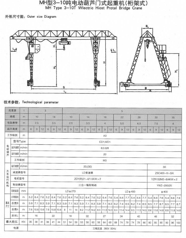注:大車導(dǎo)電形式有大車導(dǎo)電架和電纜卷筒兩種,由用戶任選一種,電纜卷筒規(guī)格及安裝位置視具體情況選擇。