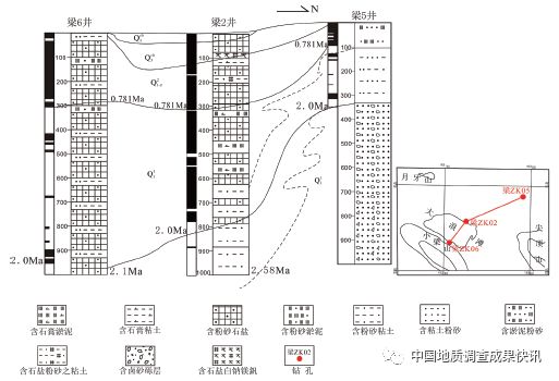 (3)通過鉆孔巖心年代學(xué)研究,厘定了該類砂礫層孔隙含鉀鹵水的地質(zhì)時(shí)代與儲(chǔ)鹵層沉積環(huán)境(圖3)。對(duì)北部山前帶代表性梁ZK05鉆孔古地磁測(cè)年研究可知,B/M界限的深度位于94m處。149m前巖心沉積速率相對(duì)較慢(0.14m/ka),推算出鉆孔最頂部年齡約為111ka,這與該區(qū)出露晚更新世地層的實(shí)際地質(zhì)情況相符。149m后沉積速率相對(duì)較高(0.2073m/ka)。推算出鉆孔330m深處的年齡為2046ka。這也是砂卵礫石開始堆積的時(shí)間。梁ZK02孔巖心古地磁測(cè)年求得其底部1000m處年齡為2.58Ma,巖性表現(xiàn)為黃褐色、棕紅色、灰白色含粉砂黏土,而到梁ZK06孔,其底部1000m處古地磁年齡為2.1Ma,巖性為粗粒含粉砂石鹽。以上表明,由北部阿爾金山前向南大浪灘干鹽湖凹陷中心,巖相由扇三角洲前緣的砂礫逐漸過渡到濱湖的含粉砂黏土(梁ZK02),直至鹽湖沉積(梁ZK06)。由此可知,這種新型砂礫層含鉀鹵水儲(chǔ)鹵層形成時(shí)代為2.58~2.00Ma,為早更新世早期(鄭綿平等,2015)。