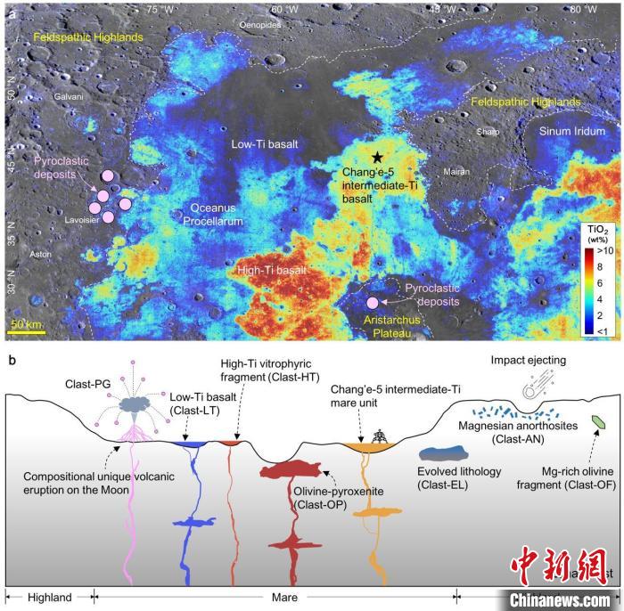 中國科學院地球化學研究所曾小家博士、李雄耀研究員和劉建忠研究員通過分析了超過3000顆嫦娥五號月壤顆粒,識別出了7顆不同于嫦娥五號中鈦玄武巖的火成巖碎屑,包括:高鈦;郀顜r石碎屑、低鈦玄武巖碎屑,橄欖輝石巖碎屑、鎂質斜長巖碎屑、高度演化巖石碎屑、富鎂橄欖石碎屑和火山玻璃碎屑;谶@些巖屑的巖石學、礦物學和地球化學數(shù)據(jù),分析并討論了其成因、與阿波羅(Apollo)巖石的異同、來源、地質意義等。