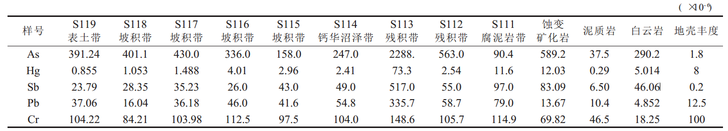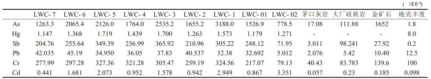 高嶺石中As的含量高達(dá) 778.5×10-6~3188.0×10-6之間。Cr、Sb也具有較高的含量。與茅口灰?guī)r、大廠硅質(zhì)巖和紫木幽原生卡林型金礦石相比,高嶺石中Pb、Cr、Cd等的含量均明顯高于各類巖( 礦) 石, 其中 Cr、Cd、Pb 等的含量高出各類巖( 礦) 石幾至幾十倍。與地殼豐度相比, 高嶺石中 Cr、Pb、Cd、As、Sb、Hg 的含量明顯較高, 其中 As、Sb、Hg 的含量高達(dá)上百倍。