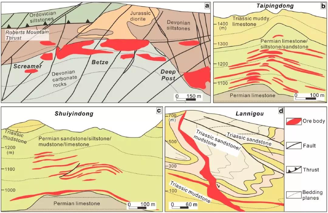 針對這一研究爭議,中國地質(zhì)大學(xué)(北京)“巖漿-熱液演化與金屬成礦”求真群體成員王慶飛教授在國家重點研發(fā)計劃項目“青藏高原碰撞造山成礦系統(tǒng)深部結(jié)構(gòu)與成礦過程”和國家重點基礎(chǔ)研究發(fā)展計劃“中國西南特提斯典型復(fù)合成礦系統(tǒng)及其深部驅(qū)動機制”資助下,運用成礦系統(tǒng)的礦床—礦田—成礦省多尺度研究思路,對右江盆地和美國內(nèi)華達卡林型金礦進行了系統(tǒng)類比研究(圖1),認為右江盆地金礦與內(nèi)華達礦床具有更多的相似性,可歸類為卡林型金礦。