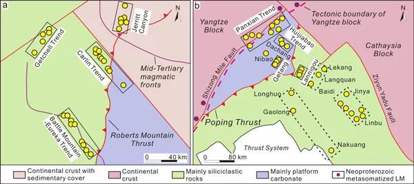 取得創(chuàng)新性認識如下: 1、礦床尺度:右江盆地三疊紀金礦與內(nèi)華達第三紀卡林型金礦在蝕變和礦物組成方面有諸多相似性,但是右江盆地金礦黃鐵絹英蝕變更為普遍,形成溫度普遍高出約60℃和形成深度高出約2公里(與右江更大的剝蝕程度一致)。 2、礦田尺度:右江和內(nèi)華達礦床均產(chǎn)于寬緩背斜、單斜、半地壘或變形沉積地層的再活化伸展斷層內(nèi),成礦作用均發(fā)生于巖石圈伸展的環(huán)境。 3、成礦省尺度:右江和內(nèi)華達礦床均呈多組正交斷裂走向分布,而這些正交斷裂走向與成礦省正交邊界幾乎完全平行(圖2)。兩個成礦省均位于交代巖石圈地幔之上。右江盆地缺乏與金礦形成同時代的巖漿侵入,而內(nèi)華達金礦明顯地更靠近熱能和深部流體來源可很好地解釋內(nèi)華達金資源量更高的現(xiàn)象。 該研究開展多尺度的區(qū)域成礦系統(tǒng)對比對比,其成果對卡林型金礦省成因的深入理解有重要意義。
