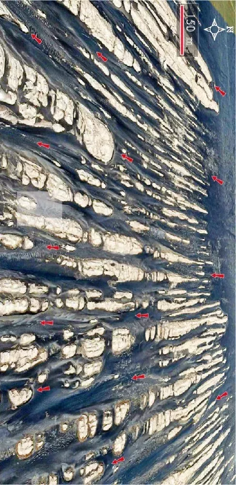 照片左上部分為標(biāo)準(zhǔn)的雅丹地貌,第四紀(jì)河湖相沉積物在烈風(fēng)吹蝕下形成白色的長壟狀地貌,地貌形態(tài)與當(dāng)?shù)氐氖⑿酗L(fēng)向(紅色箭頭)一致(參見圖1)。照片右下部分近東西向出露的白色壟狀地貌為間歇性水流沖蝕而成(如黃色箭頭所示),與現(xiàn)在的盛行風(fēng)向幾乎垂直,因此常常被吹裂,形成孤立的地貌景觀。從本質(zhì)上講,羅布泊地區(qū)的水陸變遷、流水與風(fēng)的侵蝕作用等等均與青藏高原的隆升密切相關(guān),地球表面的面貌(地貌)是地質(zhì)運(yùn)動的結(jié)果。羅布泊地區(qū)獨(dú)特的地質(zhì)背景造成了其獨(dú)特的地貌景觀。