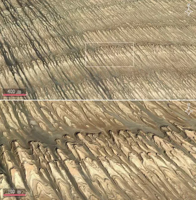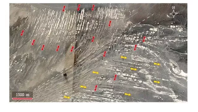 壟脊高數(shù)十厘米至數(shù)十米,溝槽寬數(shù)米,長數(shù)十米至數(shù)百米,少數(shù)長過千米。溝槽間大部分被流沙充填。因長時間遭受風(fēng)蝕,單個壟脊常呈鰭形或流線形,迎風(fēng)面通常為圓弧狀,背風(fēng)面細(xì)長或呈分散狀。溝槽間充填的流沙表面通常保留有明顯的風(fēng)成波紋。