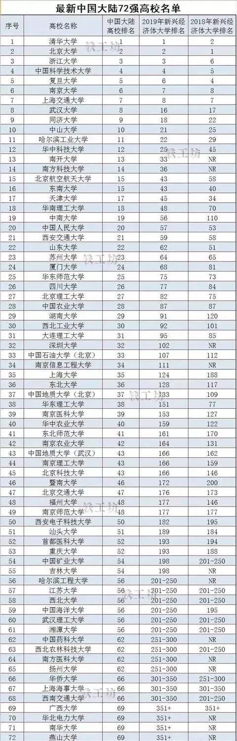 上表是筆者根據(jù)泰晤士高等教育發(fā)布的“2019年新興經(jīng)濟體大學排名”數(shù)據(jù),整理出的最新版“中國大陸72強高校名單”,并予以排名。中國大陸高校排名前十位的大學中有八所在泰晤士發(fā)布的“2019世界大學排名”中也位列中國大陸前十,它們是清華大學、北京大學、浙江大學、中國科學技術(shù)大學、復(fù)旦大學、南京大學、上海交通大學、中山大學。此次排名前七的高校為清華北大加上華東五校,“泰晤士2019世界大學排名”中國大陸排名前七的高校也是清北加華五,只是名次略微有些不同,“2019新興經(jīng)濟體大學排名”中國大陸位列第三的是浙江大學,排名第四的中國科學技術(shù)大學;“2019世界大學排名”中國大陸排名第三的則是中國科學技術(shù)大學,排名第四的是浙江大學。