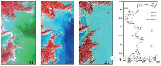 (3)在有效服務(wù)于海洋生態(tài)文明和海洋礦產(chǎn)資源開(kāi)發(fā)利用等方面取得3項(xiàng)重要成果,實(shí)現(xiàn)了轉(zhuǎn)化應(yīng)用和有效服務(wù)。①利用岸灘監(jiān)測(cè)與衛(wèi)星遙感等方法,對(duì)調(diào)查區(qū)岸線(xiàn)變遷進(jìn)行了系統(tǒng)監(jiān)測(cè),分析了20年來(lái)調(diào)查區(qū)岸線(xiàn)變化情況(圖2),并進(jìn)行了岸線(xiàn)變化的控制因素,認(rèn)為人類(lèi)活動(dòng)及風(fēng)暴潮是控制岸線(xiàn)變遷的主要原因。②系統(tǒng)研究調(diào)查區(qū)沉積動(dòng)力環(huán)境,總結(jié)了海洋沉積動(dòng)力特征及泥沙輸運(yùn)機(jī)制;研究了海水有機(jī)物分布規(guī)律,探討了其主要來(lái)源。
