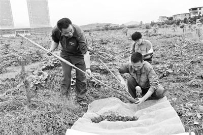 地調(diào)院技術(shù)人員在福州多目標(biāo)地球化學(xué)調(diào)查與土地規(guī)劃示范野外取樣現(xiàn)場