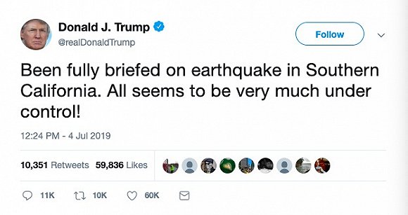 震中瑟爾斯谷地區(qū)人煙稀少,當?shù)卣Q沒有收到傷亡和主要基礎(chǔ)設(shè)施被毀的報告。美國總統(tǒng)特朗普也發(fā)推特說,他已經(jīng)收到關(guān)于南加州地震的簡報,一切基本都在控制之中。