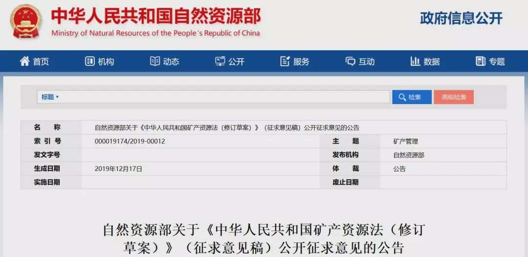 自然資源部關(guān)于《中華人民共和國礦產(chǎn)資源法(修訂草案)》(征求意見稿)公開征求意見的公告