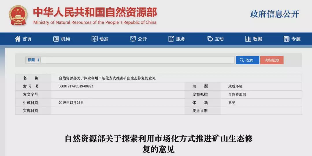 12月24日,自然資源部公開(kāi)發(fā)布《關(guān)于探索利用市場(chǎng)化方式推進(jìn)礦山生態(tài)修復(fù)的意見(jiàn)》,通過(guò)自然資源政策激勵(lì),吸引社會(huì)各方投入,探索推行市場(chǎng)化運(yùn)作、科學(xué)化治理的礦山生態(tài)修復(fù)模式。