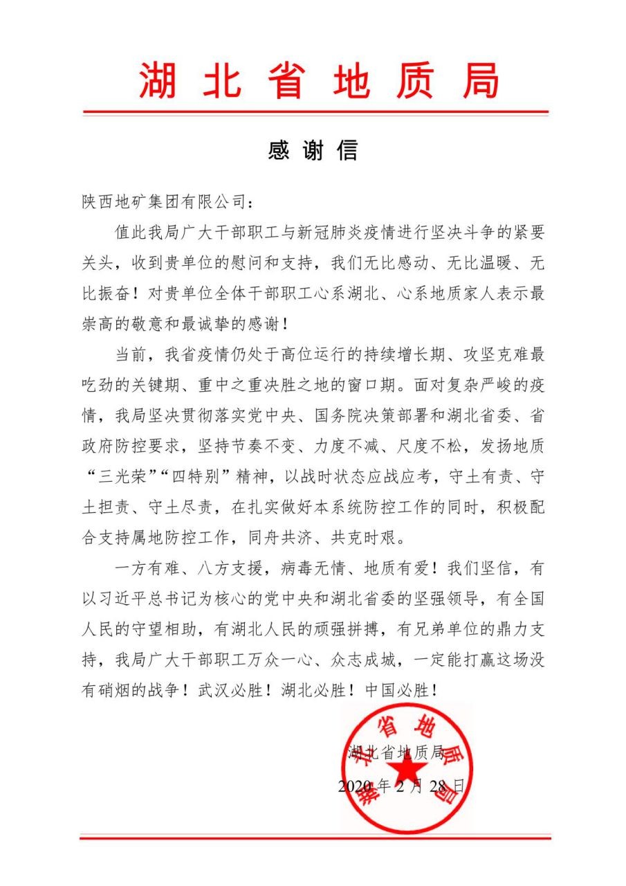 編者按:地礦一家親。自新冠肺炎疫情發(fā)生以來,陜西地礦集團(tuán)在做好自身疫情防控工作的同時,一直牽掛著身處抗疫主戰(zhàn)場的湖北省地質(zhì)局干部職工的安全與健康。2月27日,陜西地礦集團(tuán)疫情防控領(lǐng)導(dǎo)小組召開會議決定,向湖北省地質(zhì)局捐款50萬元。2月28日,湖北省地質(zhì)局向陜西地礦集團(tuán)發(fā)來感謝信,感謝陜西地礦集團(tuán)的無私援助、大愛無疆,感謝陜西地礦人在湖北最艱難的時候,與湖北省地質(zhì)局的干部職工一道共抗疫情、共克時艱。有兄弟單位的同舟共濟(jì)、守望相助,相信我們一定能夠打贏這場沒有硝煙的人民戰(zhàn)爭!