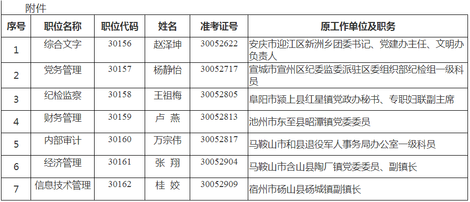 根據(jù)《2019年度安徽省省直機關(guān)公開遴選公務(wù)員工作實施方案》(皖組辦字〔2019〕41號)等規(guī)定,經(jīng)報名、筆試、面試、體檢、考察等程序,經(jīng)研究,確定趙澤坤等7名同志為安徽省地質(zhì)礦產(chǎn)勘查局擬遴選人員,現(xiàn)予以公示。公示時間:2020年2月28日至3月5日(5個工作日)。如有問題,請于公示期間及時向省委組織部、安徽省地質(zhì)礦產(chǎn)勘查局反映,監(jiān)督電話:0551-62609724、0551-64666970。