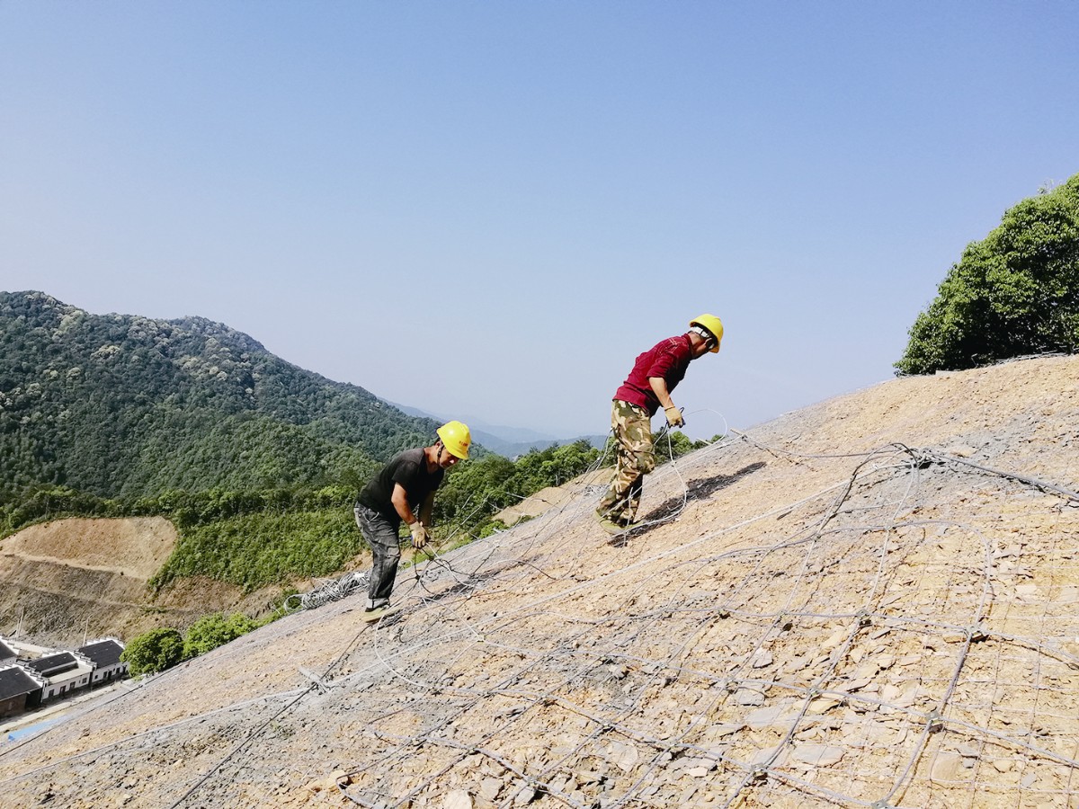 該院采用工程措施和生態(tài)恢復(fù),保護(hù)邊坡不致因掉塊、崩塌失穩(wěn)而危及安置房、行人車輛、小區(qū)市政設(shè)施安全。施工內(nèi)容包括削方及修整、鋼筋錨桿、安裝防護(hù)網(wǎng)、噴射植被混凝土綠化坡面、筑擋土墻、施工(截)排水工程。圖為施工現(xiàn)場(chǎng)。
