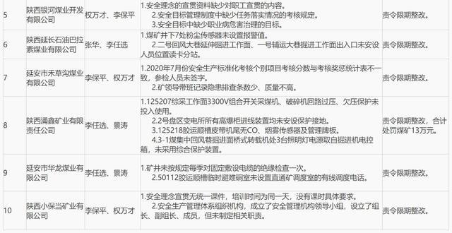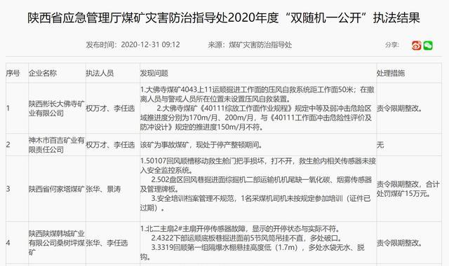 2020年12月31日,陜西省應(yīng)急管理廳發(fā)布煤礦災(zāi)害防治指導(dǎo)處2020年度雙隨機一公開“執(zhí)法結(jié)果,其中神木市百吉礦業(yè)有限責(zé)任公司、陜西延長石油巴拉素煤業(yè)、陜西小保當(dāng)礦業(yè)有限公司因發(fā)現(xiàn)問題,被責(zé)令整改。