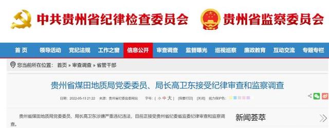 據(jù)貴州省紀委監(jiān)委網(wǎng)站5月13日消息,貴州省煤田地質(zhì)局黨委委員、局長高衛(wèi)東涉嫌嚴重違紀違法,目前正接受貴州省紀委省監(jiān)委紀律審查和監(jiān)察調(diào)查。 簡歷顯示,高衛(wèi)東,1972年出生,河南鄧州人,還曾任貴州省交通運輸廳黨委書記、貴州省交通運輸廳(省交通戰(zhàn)備辦公室)廳長(主任),中國貴州茅臺酒廠(集團)有限責任公司黨委書記、董事長等職務。 來源:貴州省紀委監(jiān)委網(wǎng)站