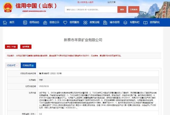 根據(jù)信用網(wǎng)站公開信息顯示,泰安新泰市羊泉礦業(yè)有限公司因違反《中華人民共和國安全生產(chǎn)法》有關(guān)規(guī)定遭到行政處罰。