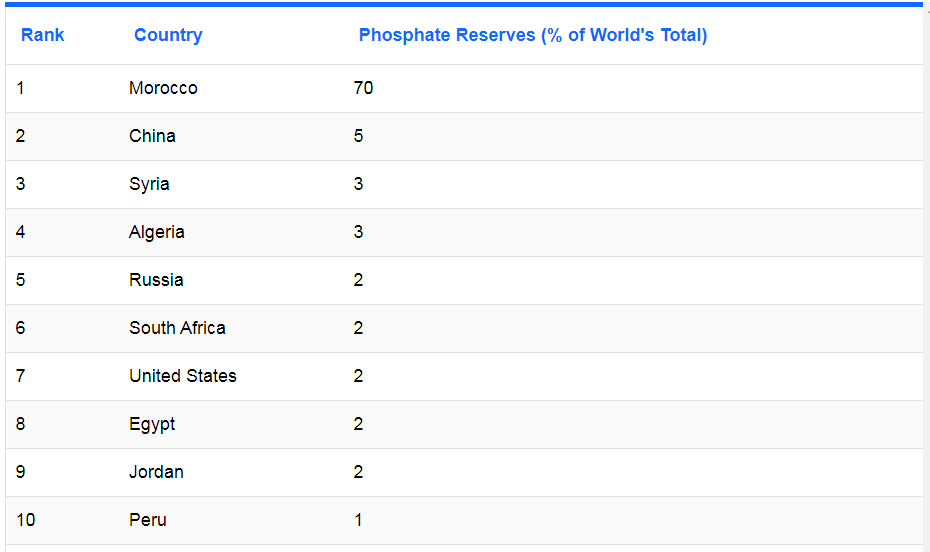 世界上大部分磷酸鹽儲量都在摩洛哥,約占總儲量的 70%,即 500 億噸。它也是第二大生產(chǎn)商,大部分產(chǎn)量來自西撒哈拉的 Bou Craa 礦。摩洛哥仍然是最大的磷酸鹽出口國。然而,高昂的采礦成本和戰(zhàn)爭威脅使該國的磷酸鹽生產(chǎn)脫軌。