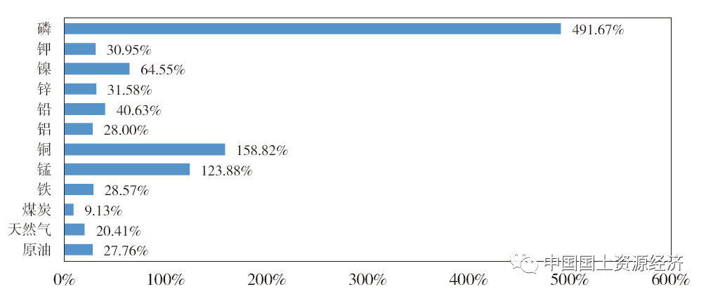 根據(jù)中央對保障糧食安全和能源資源安全的重要指示精神,對影響糧食安全、能源安全,以及對國民經(jīng)濟發(fā)展中影響基礎(chǔ)設施建設和制造業(yè)發(fā)展所需的通用礦產(chǎn)、“雙碳”目標下對能源轉(zhuǎn)型至關(guān)重要的礦產(chǎn),原則上都可以作為保供的重點對象。但是,從實際情況看,一方面,2021年全國原油、天然氣、煤炭、鐵礦石、銅精礦、鋁土礦、錳礦、鉻鐵礦等8種礦產(chǎn)品進口額合計占礦產(chǎn)品進口總額的比重已逼近90%。另一方面,這8種礦產(chǎn)品進口體量大,絕大多數(shù)對外依存度超過了50%(圖4),而且恰恰是影響能源安全和基礎(chǔ)設施建設及制造業(yè)發(fā)展的主要通用礦產(chǎn),加上影響糧食安全生產(chǎn)所需的鉀鹽、磷礦,這10種礦產(chǎn)已成為當下保供的重點。“雙碳”目標下,雖然國內(nèi)鎳、鈷、鋰等供需小體量的礦產(chǎn)也很緊缺,但是這些礦產(chǎn)近幾年“走出去”成果較為豐碩,且對經(jīng)濟社會發(fā)展暫不會造成全局性影響,可暫不作為保供重點。