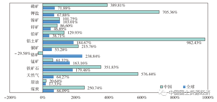 圖1 2021年與2001年全球主要礦產(chǎn)儲量增幅情況對比