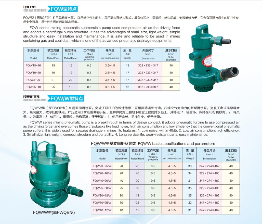 礦用風(fēng)動潛水泵以下(簡稱水泵)是我公司自行研制開發(fā)的一種新產(chǎn)品,本產(chǎn)品采用轉(zhuǎn)子與泵體同軸聯(lián)結(jié)的機(jī)械產(chǎn)品,采用立式結(jié)構(gòu)、下泵式。執(zhí)行標(biāo)準(zhǔn):MT/T315-92、Q/KA003-2013。煤礦用風(fēng)動潛水泵結(jié)構(gòu)緊湊,移動、裝拆、維修方便。泵體渦道采用高效節(jié)能水力模型,葉輪特殊設(shè)計。該水泵排污水能力強(qiáng),流量大,揚(yáng)程高等優(yōu)點。 FQW 型系列水泵適用于含有瓦斯與煤塵爆炸危險場所排水作業(yè),可廣泛用于煤礦井下任何作業(yè)面,輸送含有煤粉、泥沙顆粒的地下水,使用安全、可靠,并有效地改善現(xiàn)場空氣質(zhì)量。