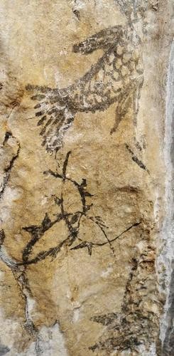 雖然洞口距離最近的村民家只有100多米,但因為茂密的灌木遮擋,平日少有人往來。也正是因為這樣,溶洞內(nèi)鮮有人類活動痕跡,保存完好。同時,在洞口左側(cè)的巖壁還發(fā)現(xiàn)“三魚共頭”巖畫。