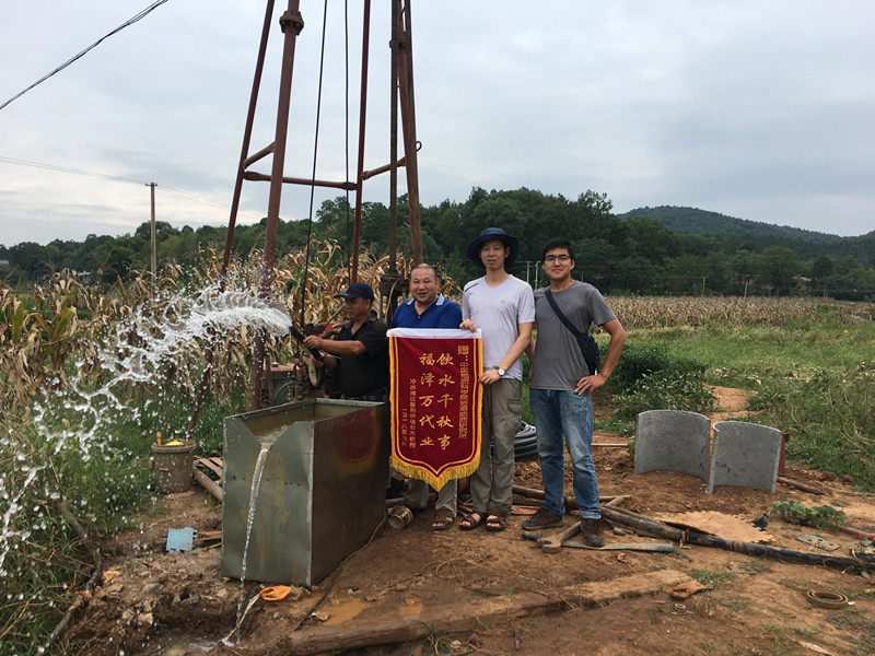 4口井分別位于冷水灘區(qū)楊村甸鄉(xiāng)沙子坳村、花橋街鎮(zhèn)坪塘村、普利橋鎮(zhèn)杉木橋村、祁陽縣文明鋪鎮(zhèn)大泉灣村,幾個村均處于衡紹干旱走廊分布區(qū),生活飲用水問題一直很突出。其中普利橋鎮(zhèn)衫木橋村為國家級脫貧示范村,地形地貌屬于巖溶丘陵谷地,谷地寬300-400米,底部較平緩,山坡坡度20-30度,底部覆蓋的第四系土層厚度3-6米,地層巖性為泥盆系錫礦山組碳酸鹽巖,地層展布、節(jié)理裂隙發(fā)育程度主要受北北東向區(qū)域性斷裂的控制。盡管國家有關(guān)部門已做有前期配套設(shè)計(jì)規(guī)劃,但該村現(xiàn)有村民目前飲用水還是以自挖手提井為主,飲用水主要取淺層地表松散層孔隙水,飲用水的水量、水質(zhì)均得不到有效保障,非常不利于國家級脫貧示范村的建設(shè)。野外項(xiàng)目組結(jié)合地方需求以及對該村水文地質(zhì)條件、地質(zhì)構(gòu)造的分析,成功實(shí)施一口探采結(jié)合孔,孔深110米,涌水量為482.6方/天,可為該村5000余人提供水源保障。