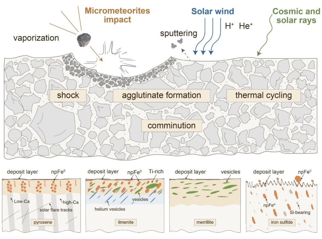 數(shù)十億年來,月球表面遭受了強(qiáng)烈的太空風(fēng)化作用,包括微隕石撞擊、太陽風(fēng)及銀河宇宙射線的輻射。這些過程極大地改造了月球表面物質(zhì)的微觀形貌、晶體結(jié)構(gòu)和化學(xué)成分,進(jìn)而改變了月球的光譜特征,造成地質(zhì)分析的多解性。因此,深入研究撞擊和太陽風(fēng)輻射與物質(zhì)的相互作用過程與機(jī)理,是認(rèn)識(shí)月球表面物質(zhì)演化和空間環(huán)境變化過程的關(guān)鍵,并為行星的宜居環(huán)境及其演化提供了不可替代的作用。