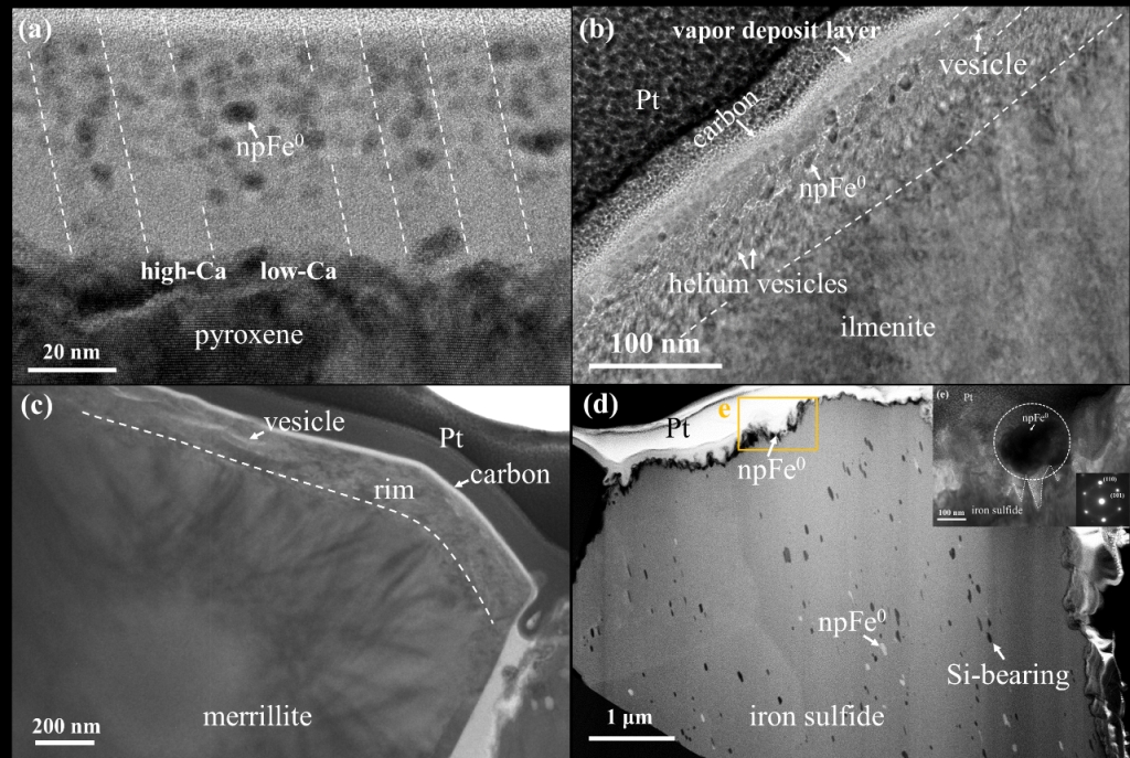 分析結(jié)果表明,暴露在玄武巖碎屑表面的所有礦物相都存在富Si/O元素的再沉積層,往下是太陽風(fēng)輻照損傷層,但太陽風(fēng)損傷層的結(jié)構(gòu)和化學(xué)成分變化與基體礦物的種類有關(guān)(圖2)。納米鐵(npFe0)、非晶化和囊泡結(jié)構(gòu)是最常見的太空風(fēng)化特征。我們發(fā)現(xiàn)輝石受太陽風(fēng)輻照后損傷層的片層結(jié)構(gòu)與輝石基體的出熔片層結(jié)構(gòu)一致,提供了太陽風(fēng)還原納米鐵的確鑿證據(jù)。表面損傷層發(fā)生了非晶化,非晶層內(nèi)的納米鐵顆粒呈球形,但晶粒尺寸(~3-5 nm)與基體片層的鐵含量相關(guān)。鈦鐵礦受太陽風(fēng)輻照保持了晶體結(jié)構(gòu),但發(fā)生了Fe-Ti元素遷移,還原的納米鐵顆粒呈拉長形(~20 nm)。硫化物表面呈鋸齒狀結(jié)構(gòu),沒有明顯的太陽風(fēng)作用區(qū)域,主要是硫化物受太陽風(fēng)離子剝蝕造成脫硫而形成鐵晶須(幾十nm~300 nm)。貧鐵的白磷鈣礦表面沒有發(fā)現(xiàn)納米鐵顆粒。另外,鈦鐵礦和白磷鈣礦的損傷層都出現(xiàn)了囊泡結(jié)構(gòu),但其形態(tài)不同,可能與各自的晶體結(jié)構(gòu)及受到的表面張力有關(guān)。圖2 不同礦物相的微觀結(jié)構(gòu)