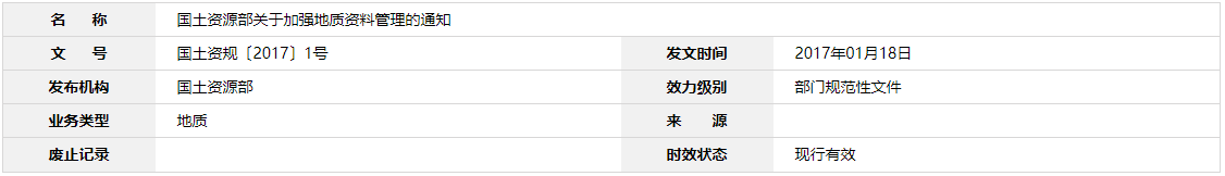 本通知有效期為8年。本通知自發(fā)布之日起施行,《國(guó)土資源部關(guān)于加強(qiáng)地質(zhì)資料匯交管理的通知》(國(guó)土資發(fā)〔2010〕32號(hào))、《國(guó)土資源部關(guān)于印發(fā)<地質(zhì)資料匯交監(jiān)管平臺(tái)建設(shè)工作方案>的通知》(國(guó)土資發(fā)〔2011〕78號(hào))、《國(guó)土資源部辦公廳關(guān)于進(jìn)一步加強(qiáng)原始地質(zhì)資料管理的通知》(國(guó)土資廳發(fā)〔2012〕57號(hào))、《關(guān)于進(jìn)一步做好地質(zhì)資料保護(hù)登記管理工作的通知》(國(guó)土資發(fā)〔2007〕153號(hào))、《關(guān)于做好石油、天然氣、煤層氣、放射性礦產(chǎn)地質(zhì)資料和海洋地質(zhì)資料管理有關(guān)工作的通知》(國(guó)土資發(fā)〔2004〕53號(hào))、《國(guó)土資源部辦公廳關(guān)于加強(qiáng)探礦權(quán)人放棄區(qū)塊范圍地質(zhì)資料匯交管理的通知》(國(guó)土資廳發(fā)〔2011〕51號(hào))、《關(guān)于報(bào)送地質(zhì)資料及管理信息的通知》(國(guó)土資廳發(fā)〔2007〕148號(hào))、《國(guó)土資源部辦公廳關(guān)于做好地質(zhì)資料匯交監(jiān)管平臺(tái)建設(shè)有關(guān)工作的函》(國(guó)土資廳函〔2011〕1079號(hào))、《關(guān)于<無(wú)證勘查地質(zhì)資料利用等問(wèn)題的請(qǐng)示>的復(fù)函》(國(guó)土資廳函〔2005〕624號(hào))、《關(guān)于非保護(hù)期內(nèi)國(guó)家出資勘查開(kāi)發(fā)形成的地質(zhì)資料利用問(wèn)題的復(fù)函》(國(guó)土資廳函〔2006〕34號(hào))、《國(guó)土資源部辦公廳關(guān)于地質(zhì)資料與礦產(chǎn)有關(guān)信息社會(huì)化服務(wù)有關(guān)問(wèn)題的復(fù)函》(國(guó)土資廳函〔2008〕588號(hào))、《關(guān)于印發(fā)<加強(qiáng)地質(zhì)資料社會(huì)化服務(wù)的若干規(guī)定>的通知》(國(guó)土資發(fā)〔2005〕215號(hào))、《關(guān)于建立健全地質(zhì)資料網(wǎng)絡(luò)服務(wù)體系的通知》(國(guó)土資發(fā)〔2006〕98號(hào))、《關(guān)于印發(fā)〈成果地質(zhì)資料電子文件匯交格式要求〉的通知》(國(guó)土資發(fā)〔2006〕210號(hào))、《關(guān)于印發(fā)〈油氣勘探與開(kāi)發(fā)地質(zhì)資料立卷歸檔要求〉的通知》(國(guó)土資發(fā)〔2006〕266號(hào))、《關(guān)于印發(fā)〈油氣成果地質(zhì)資料電子文件制作匯交細(xì)則〉和〈油氣成果地質(zhì)資料計(jì)算機(jī)著錄細(xì)則〉的通知》(國(guó)土資發(fā)〔2007〕237號(hào))同時(shí)廢止。