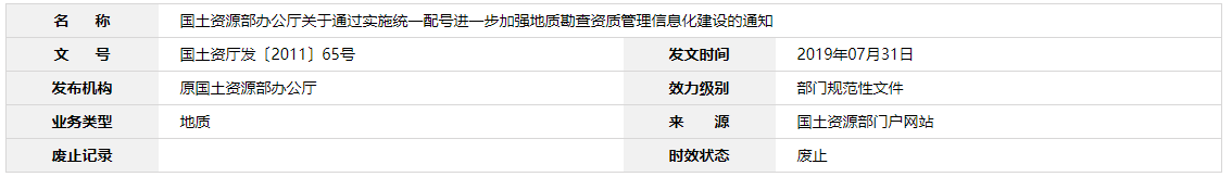 為提高地質(zhì)勘查資質(zhì)管理水平,完善地質(zhì)勘查資質(zhì)信息系統(tǒng)建設(shè),更好地應(yīng)用信息化手段促進(jìn)地質(zhì)勘查資質(zhì)管理工作的規(guī)范化,實(shí)現(xiàn)政務(wù)信息公開(kāi),提高透明度,現(xiàn)就通過(guò)實(shí)施統(tǒng)一配號(hào)進(jìn)一步加強(qiáng)地質(zhì)勘查資質(zhì)管理信息化建設(shè)有關(guān)事項(xiàng)通知如下: