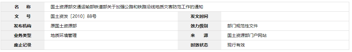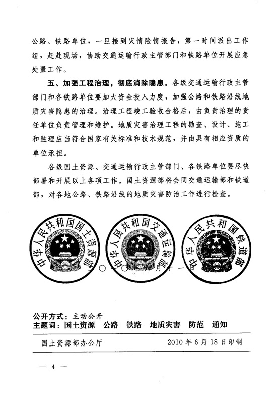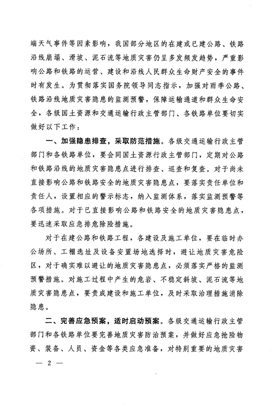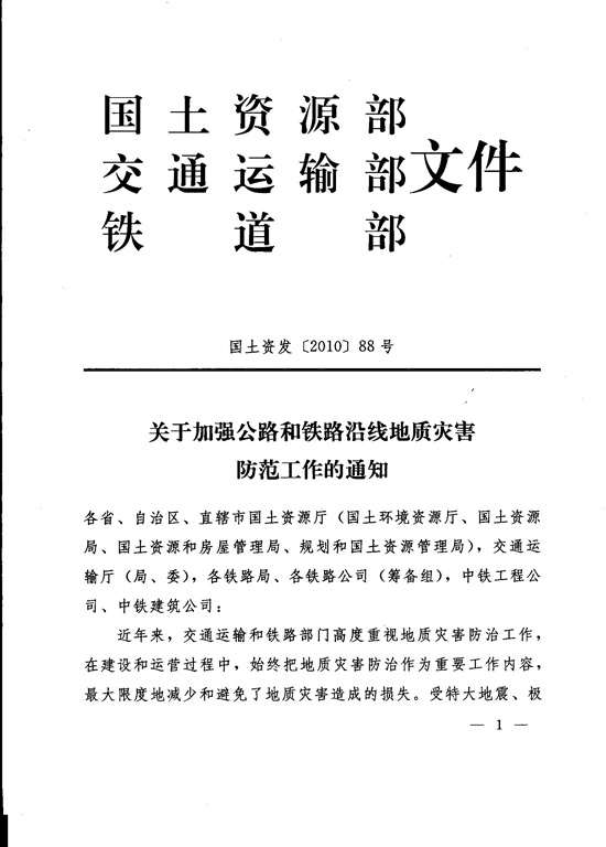 國土資源部交通運輸部鐵道部關于加強公路 和鐵路沿線地質(zhì)災害防范工作的通知