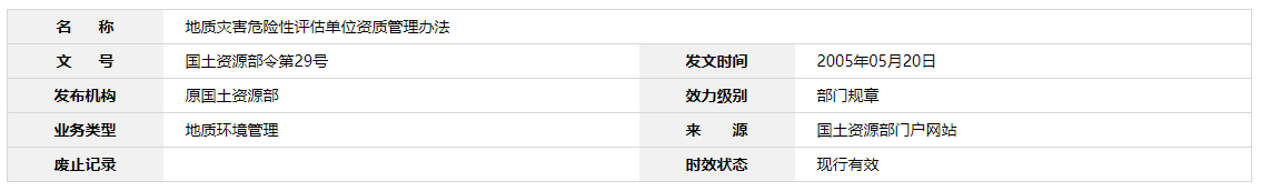 。2005年5月20日中華人民共和國國土資源部令第29號(hào)公布 根據(jù)2015年5月6日國土資源部第2次部務(wù)會(huì)議《國土資源部關(guān)于修改〈地質(zhì)災(zāi)害危險(xiǎn)性評(píng)估單位資質(zhì)管理辦法〉等5部規(guī)章的決定》修正)