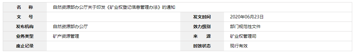 為貫徹落實國務(wù)院關(guān)于加強(qiáng)事中事后監(jiān)管要求,進(jìn)一步規(guī)范礦業(yè)權(quán)出讓登記行為,加強(qiáng)政務(wù)公開和社會服務(wù),提升礦業(yè)權(quán)管理信息化水平,現(xiàn)印發(fā)《礦業(yè)權(quán)登記信息管理辦法》,請遵照執(zhí)行。如有問題,請及時告知,F(xiàn)將有關(guān)事項通知如下:
