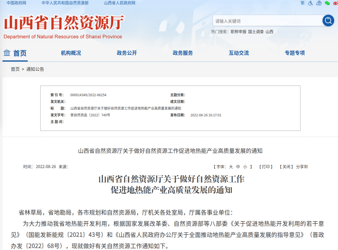 為大力推動(dòng)我省地?zé)崮荛_(kāi)發(fā)利用,根據(jù)國(guó)家發(fā)展改革委、自然資源部等八部委《關(guān)于促進(jìn)地?zé)崮荛_(kāi)發(fā)利用的若干意見(jiàn)》(國(guó)能發(fā)新能規(guī)〔2021〕43號(hào))和《山西省人民政府辦公廳關(guān)于全面推動(dòng)地?zé)崮墚a(chǎn)業(yè)高質(zhì)量發(fā)展的指導(dǎo)意見(jiàn)》(晉政辦發(fā)〔2022〕68號(hào)),現(xiàn)就做好有關(guān)自然資源工作通知如下。