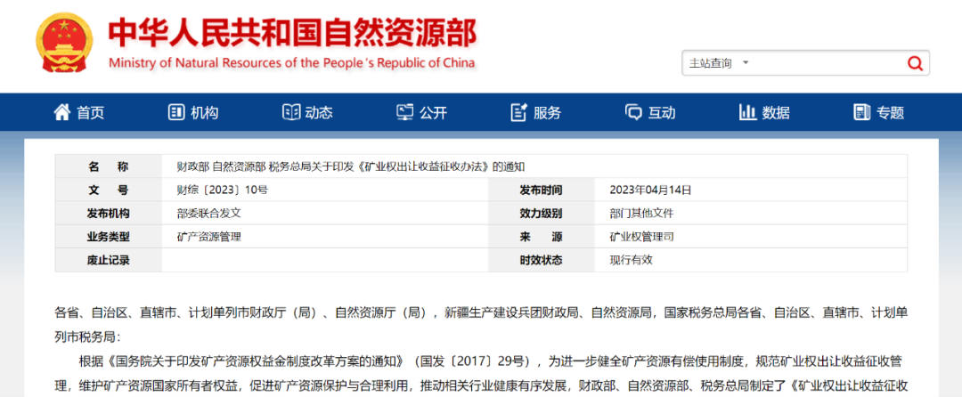 第三十七條 本辦法自2023年5月1日起施行!兜V業(yè)權(quán)出讓收益征收管理暫行辦法》(財(cái)綜〔2017〕35號)、《財(cái)政部 自然資源部關(guān)于進(jìn)一步明確礦業(yè)權(quán)出讓收益征收管理有關(guān)問題的通知》(財(cái)綜〔2019〕11號)同時廢止。