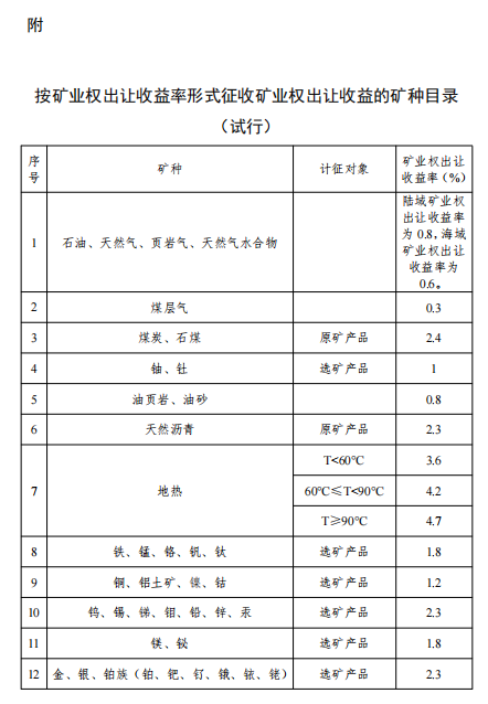 (一)適用范圍。按礦業(yè)權(quán)出讓收益率形式征收礦業(yè)權(quán)出讓收益的礦種,具體范圍為本辦法所附《按礦業(yè)權(quán)出讓收益率形式征收礦業(yè)權(quán)出讓收益的礦種目錄(試行)》(以下簡稱《礦種目錄》)!兜V種目錄》的調(diào)整,由自然資源部商財(cái)政部確定后公布。