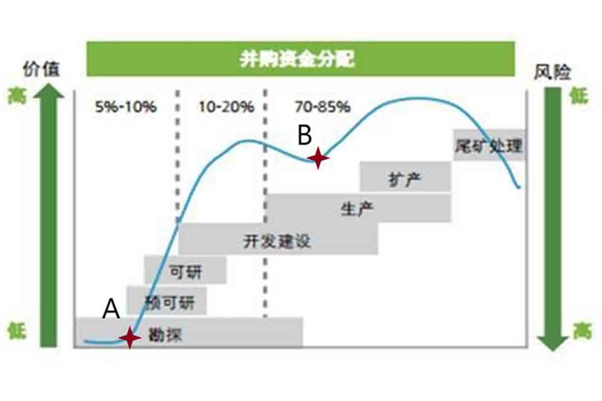 全球平均每1000個(gè)勘探項(xiàng)目,最終結(jié)果可能只有一個(gè)項(xiàng)目能成為一個(gè)可持續(xù)生產(chǎn)的礦,因此單從礦業(yè)項(xiàng)目來(lái)看,從礦業(yè)勘探發(fā)展至投產(chǎn),一路風(fēng)險(xiǎn)很高。但是,投資礦業(yè)上市公司,投資人無(wú)需等到投產(chǎn)才收回資金。在合適時(shí)候投,投資成功了回報(bào)10倍~100倍也是正常的。那么,對(duì)礦業(yè)投資,什么時(shí)候投回報(bào)率高?答案應(yīng)該在A點(diǎn)和B點(diǎn)(見(jiàn)圖1)。