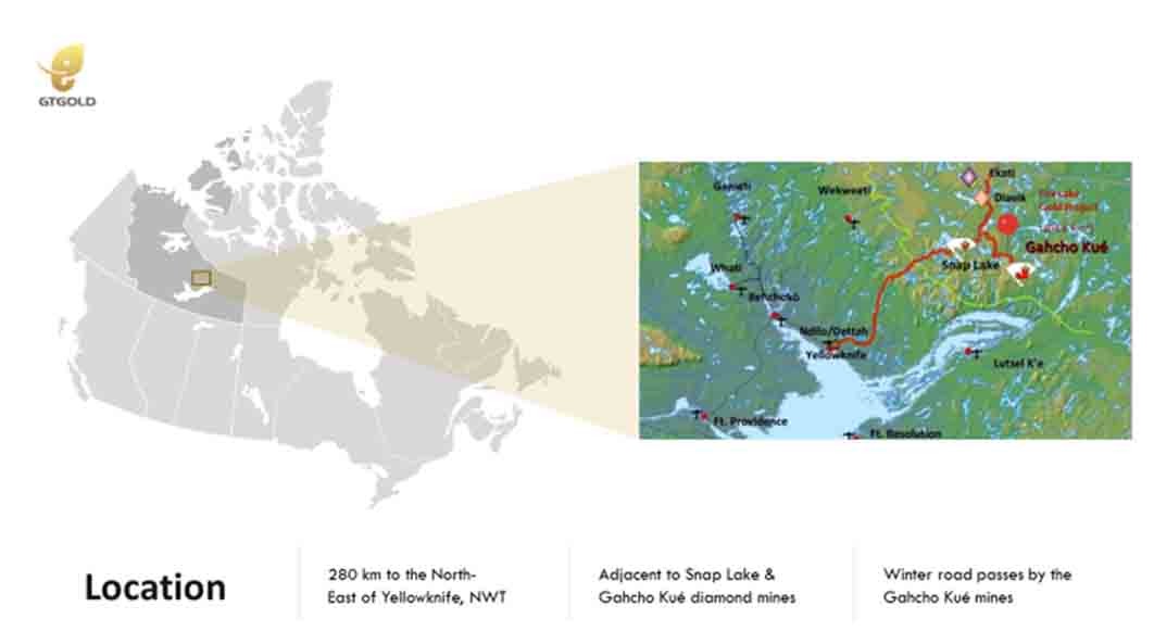 地點(diǎn):Fox Lake金礦項(xiàng)目占地面積 104.11平方公里。 該項(xiàng)目由BNT Gold Resources Ltd.全資100%擁有,位于加拿大西北地區(qū)黃刀市(Yellowknife)東北偏東280公里處(如圖)。與在采鉆石礦山 Snap Lake 和 Gahcho Kué 相鄰。通往 Gahcho Kué 礦山的冬季道路經(jīng)過(guò)Fox Lake金礦項(xiàng)目區(qū)。