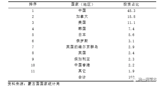 從蒙古國建國以來,蒙古國已經(jīng)與全球100多個(gè)國家(地區(qū))建立了正式的外交關(guān)系,也在積極尋求與這些國家(地區(qū))的經(jīng)濟(jì)與貿(mào)易合作,但是整體來看成果不是十分豐富。當(dāng)前與蒙古國經(jīng)濟(jì)交往較為密切的國家(地區(qū))也只有中國、加拿大、美國等國家(地區(qū))。這些國家(地區(qū))對(duì)蒙古國的投資規(guī)模相對(duì)較大,如表所示。