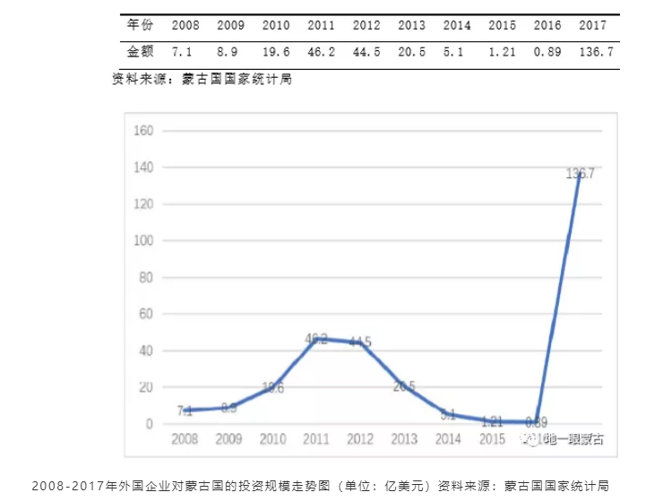 相關(guān)數(shù)據(jù)顯示,外國企業(yè)對(duì)蒙古國的投資額從2008年的7.1億美元,持續(xù)增長到2010年的19.6億美元,到2011年創(chuàng)出了歷史新高,達(dá)到46.2億美元,創(chuàng)造了歷史新高。而從2011年開始,這個(gè)投資總額就開始大幅度下滑,到2016年下滑到了0.89億美元,創(chuàng)出了歷史新低。而2017年,外國企業(yè)對(duì)蒙古國的投資額竟然增長到了136.7億美元。這一投資規(guī)模是蒙古國有史以來進(jìn)入蒙古國年投資中的最大規(guī)模。
