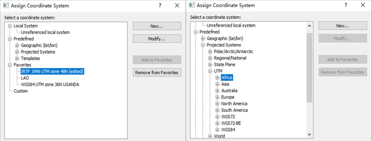 2018年筆者去非洲某國開展礦產(chǎn)勘察工作,該國礦證文件所使用坐標(biāo)系統(tǒng)的橢球參數(shù)未知。那么如何轉(zhuǎn)換坐標(biāo)系統(tǒng)得以利用GPS開展工作,尤其是判斷礦點是否在探礦范圍內(nèi),以防止因為不同坐標(biāo)系統(tǒng)的原因而遺漏礦點或者工作設(shè)計超出礦證范圍?目前,有一些軟件可以提供大多數(shù)國家的坐標(biāo)系統(tǒng)轉(zhuǎn)換,例如Surfer、GlobalMapper等軟件。該國所用坐標(biāo)系統(tǒng)筆者搜遍常用地礦軟件均未發(fā)現(xiàn),最終只能到ITRF網(wǎng)站上查詢相關(guān)的橢球參數(shù)數(shù)據(jù),而后在Surfer軟件中自建坐標(biāo)系統(tǒng)(圖1左Favorites第一行,就是自己創(chuàng)建的一個坐標(biāo)系)。后期工作時結(jié)合礦證文件所示地形地貌標(biāo)志,并經(jīng)工作現(xiàn)場核實發(fā)現(xiàn),在簡單應(yīng)用Surfer坐標(biāo)系統(tǒng)庫中的ITRF1996 UTM 48N,則理論點和實際位置存在大于500米的誤差,而自己創(chuàng)建的坐標(biāo)系最終較好地實現(xiàn)了與當(dāng)?shù)刈鴺?biāo)系的轉(zhuǎn)換和匹配,誤差小于10米。